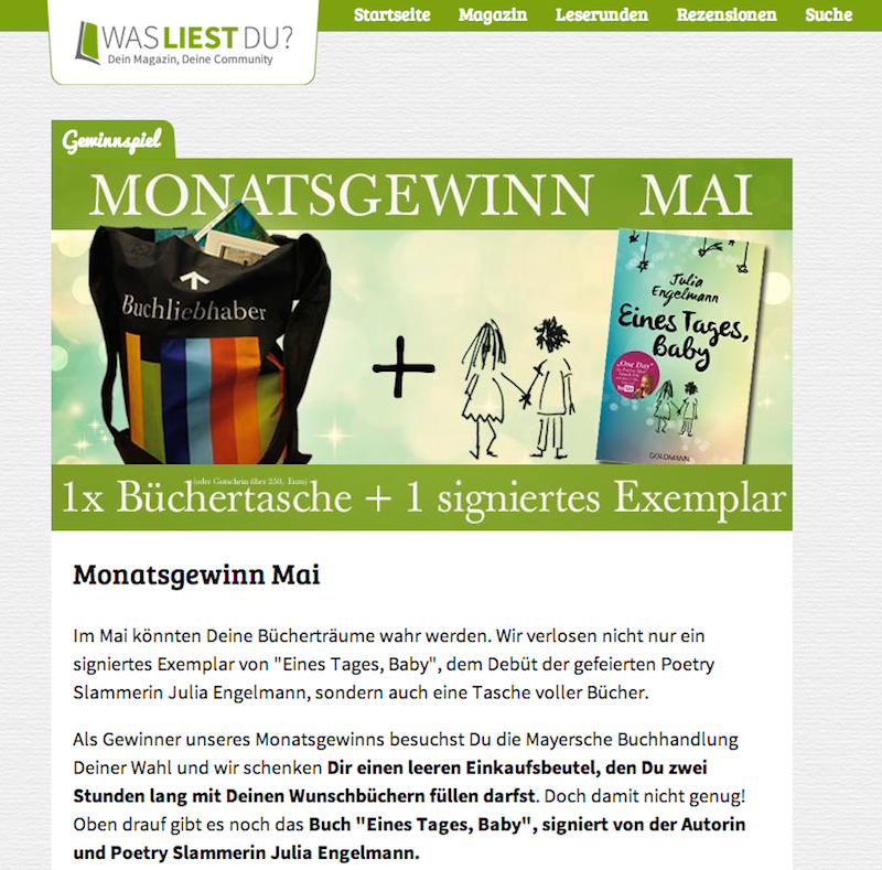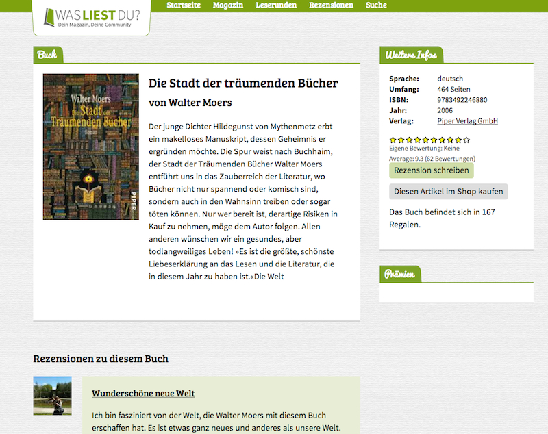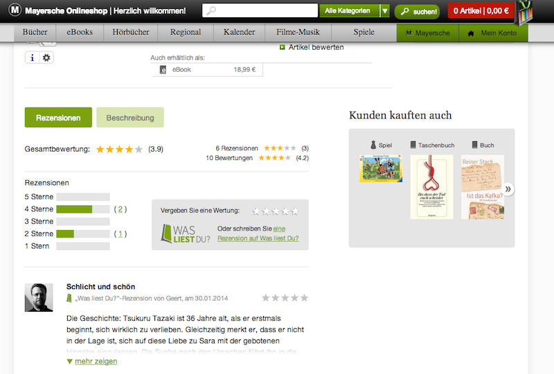 - Buchrezensionen: Die Rezensionen der Community werden – mit Verweis auf „Was liest du?“ – auch für den Online-Shop der Mayerschen genutzt (s. Screenshot oben). Die Kunden des Online-Shops werden umgekehrt auch dazu aufgerufen, eine eigene Rezension auf wasliestdu.de zu schreiben.