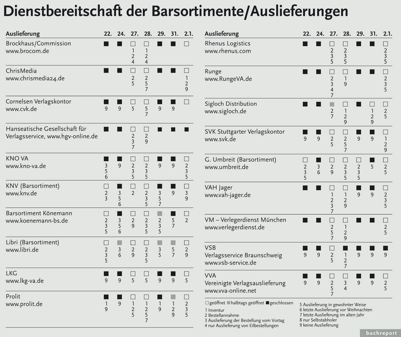 Die buchreport-Übersicht verrät, wann die Großhändler und Auslieferer geschlossen und wann geöffnet haben, der Anmerkungsapparat unten rechts erklärt die Details.