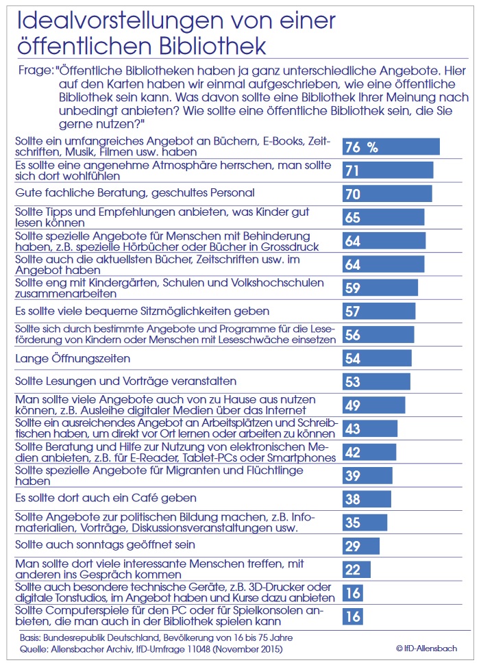 Die Studie zeigt auch, dass die Menschen unter anderem aktuelle Medienvielfalt, angenehme Atmosphäre, geschultes Personal, wirksame Leseförderung und die Kooperation mit anderen Bildungseinrichtungen erwarten: