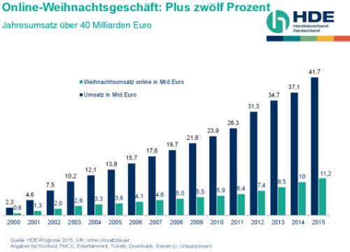 Wie in den vergangenen Jahren bleibt der Online-Handel Wachstumsmotor (Grafik: HDE). Laut HDE-Prognose sollen im E-Commerce in diesem Jahr mit 41,7 Mrd Euro 12% mehr umgesetzt werden als 2014, auf das Weihnachtsgeschäft entfallen allein 11,2 Mrd Euro (+12%).