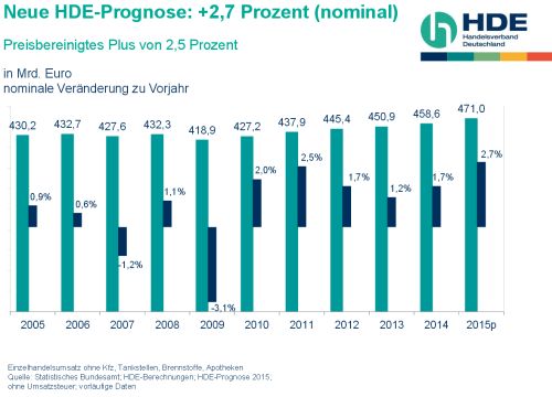 „Die Arbeitsmarktdaten sind gut, die Realeinkommen steigen und die Preissteigerungen sind moderat“, sagt HDE-Präsident Josef Sanktjohanser. Insgesamt sollen 2015 durch die guten Rahmenbedingungen 471 Mrd Euro in die Kassen der deutschen Einzelhändler gespült werden. Das sind 2,7% mehr als im Vorjahr (Grafik: HDE).