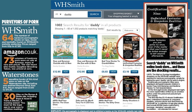 Wie „The Kernel“ und später auch britische Boulevardblätter wie „Mail on Sunday berichten, tauchten pornografische E-Books mit Vergewaltigungen, Inzest und sonstiger Gewalt neben dem Kinderbuch-Segment auf whsmith.co.uk auf, wenn der Nutzer beispielsweise das Stichwort „Daddy“ eingegeben hatte. Der britische Medienhändler bereinigt zurzeit seinen Katalog und hat in diesem Zuge seine komplette Internetseite offline geschaltet.