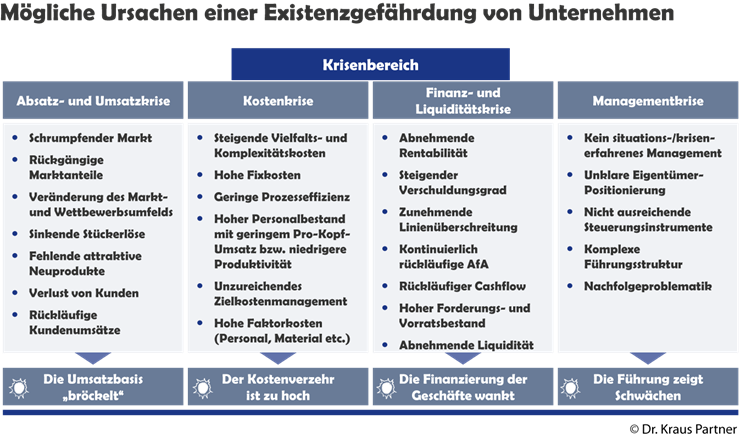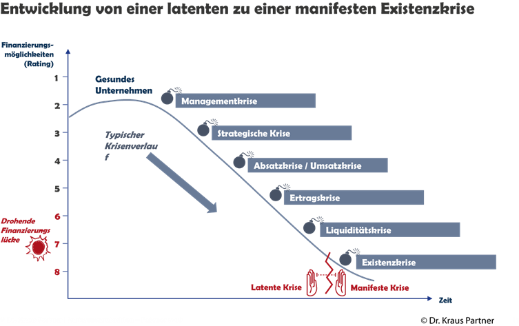 Analysiert man die Ursachen, warum Unternehmen in einer Existenzkrise stecken, zeigt sich oft folgender Verlauf: Aus einer Managementkrise erwuchs eine strategische Krise. Diese führte zu einer Absatz- und Umsatzkrise, die wiederum zu einer Ertrags- und Liquiditätskrise führte, die ihrerseits die Existenzkrise auslöste.