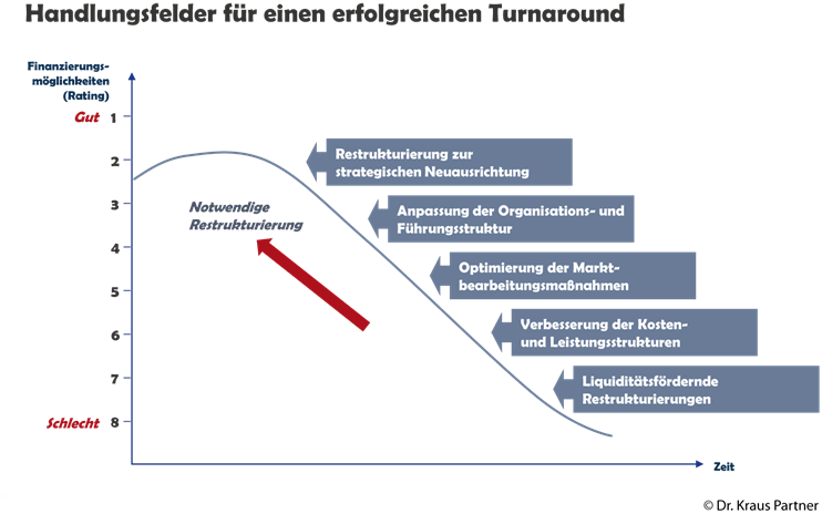 Gelingt der Turnaround, bedeutet das, dass sich das Unternehmen wieder in der Erfolgsspur befindet; seine Existenz ist nicht mehr akut bedroht. Der Turnaround ist somit ein zentraler Meilenstein in dem Changeprozess, der auf die Sanierung des Unternehmens und die Wiederherstellung seiner Wettbewerbsfähigkeit abzielt.
