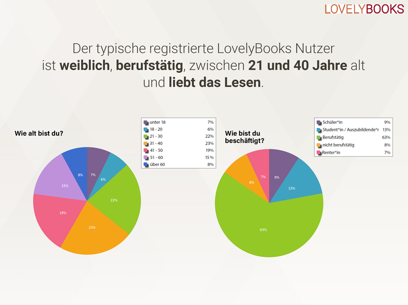 Laut der aktuellen Lovelybooks-Umfrage 2021 sind die typischen registrierten Lovelybooks-Nutzer weiblich, berufstätig und zwischen 21 und 40 Jahre alt.