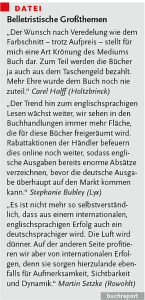 - Vor allem in der Unterhaltungs-Belletristik ist englischsprachige Literatur gefragt. Mehr als 5% der verkauften Titel sind mittlerweile Importe aus dem englischen Sprachraum. Die Kehrseite des Trends erleben die lizenznehmenden Verlage: Sie müssen zusehen, wie englische Verlage Umsatz abgreifen, indem sie eigens für den kontinentaleuropäischen Markt produzierte Ausgaben erfolgreich herausbringen, bevor die deutsche Fassung ausgeliefert wird.