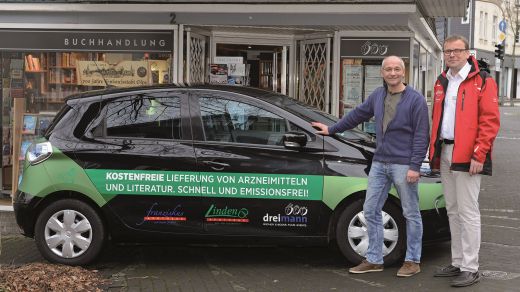 Der Buchhändler Georg Spielmann (Dreimann-Buchhandlung) und der Apotheker Gerd Franke (Linden-Apotheke) (v.l., Foto: Wolfgang Hesse) liefern im Schulterschluss: Seit Herbst vergangenen Jahres wird in Olpe ein „Elektro-Ökoflitzer“ eingesetzt, sodass Medikamente und Bücher jetzt emissionsfrei zum Kunden kommen. Die 160 Kilometer, die das Elektroauto pro Aufladung schafft, werden bei der Menge an Bestellungen auch pro Tag verfahren.