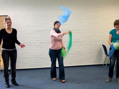 In den Räumlichkeiten des Mediacampus in Seckbach erarbeitete Referentin Christiane Rasper zusammen mit den Teilnehmerinnen Möglichkeiten Problem- und Konfliktsituationen in positive Erfahrungen zu wandeln. Dabei griff Frau Rasper auch zu ungewöhnlichen Methoden. So empfahl sie den Teilnehmerinnen schwierige Anrufe mit einer roten Clownsnase zu parieren, Verbalattacken der KollegInnen mit verblüffenden Kontern zu begegnen oder mit Tüchern zu jonglieren, um den Kopf frei zu bekommen.