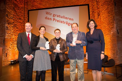 V. l.: Michael Then (Vorsitzender des Landesverbands Bayern im Börsenverein), Julia Bielenberg (Geschäftsführerin der Oetinger Verlagsgruppe, in Vertretung für Cornelia Funke), Angela Steidele (Preisträgerin Belletristik), Reiner Stach (Preisträger Sachbuch), Stellvertretende Ministerpräsidentin und Bayerische Staatsministerin für Wirtschaft und Medien, Energie und Technologie Ilse Aigner (Foto: Yves Krier)