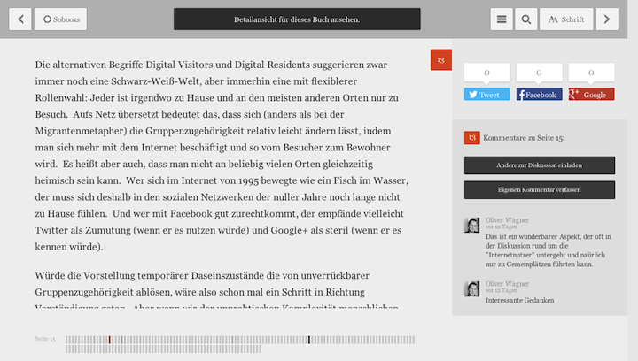 • Der Leser kann mit anderen Lesern interagieren und auf einzelnen Seiten des Buchs Kommentare hinterlassen und auf andere Kommentare antworten.