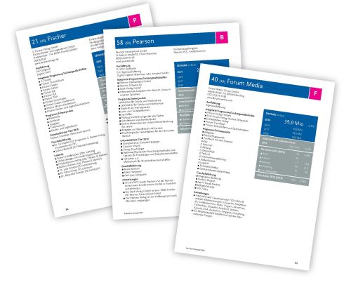 Verlage im Detail: Die buchreport-Sonderveröffentlichung „Die 100 größten Buchverlage“ stellt auf 124 Seiten die einzelnen Unternehmen mit ihren wichtigsten Kennzahlen und Arbeitsschwerpunkten vor. Das Ranking ist hier als Printausgabe, als E-Paper oder als laufend aktualisierte Online-Datenbank verfügbar.