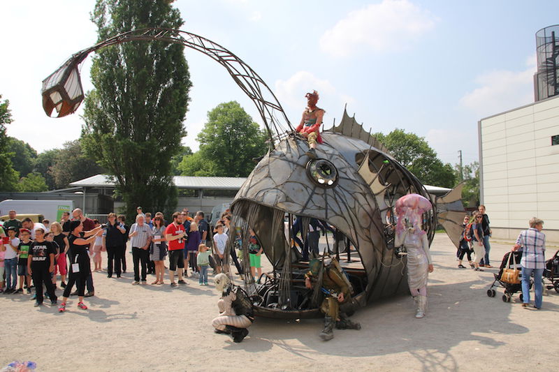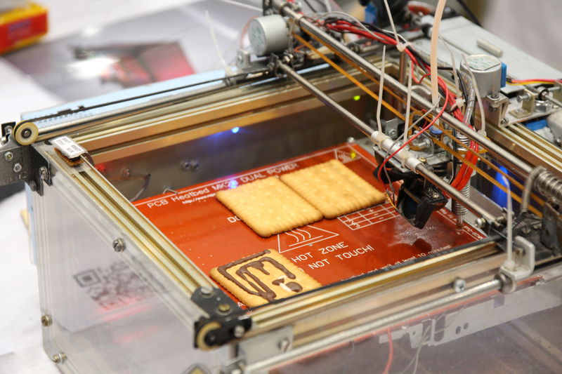 Erstmals konnten am Freitag Schulklassen (insgesamt 1500 Kinder) aus ganz Deutschland vorab die vielfältigen Projekte auf der Maker Faire kennenlernen und testen. Zu den Höhepunkten der Messe gehörte der acht Meter lange Anglerfisch aus Stahl (Foto ganz oben), der als Walking-Act eine Show zeigte, die R2-D2-Droiden aus „Star Wars“ und der Cosplayer Rudolf im schillernden Flügel-Kostüm. Zu den präsentierten Projekten zählten Bananenschaum aus der Molekularküche, Butterkekse mit Schokoladenguss aus dem 3D-Drucker (Foto oben), selbst gebaute Schwerter, Jojos oder eigenhändig genähte Schlüsselanhänger, gebastelte Blink-LED-Sticker oder selbstgeschweißte Straßenbahnen.