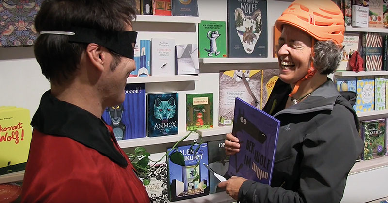 Buchpalast: Mit witzigen Kurzvideos über Superleserman sorgt die Münchner Buchhandlung Buchpalast für gute Stimmung auf Homepage und Onlineshop-Webseite. Für die nächsten Folgen, die im kommenden Jahr gedreht werden sollen, gebe es schon jede Menge neuer Ideen, sagt Buchhändlerin Katrin Rüger (rechts). (Foto: Michael Weiser)