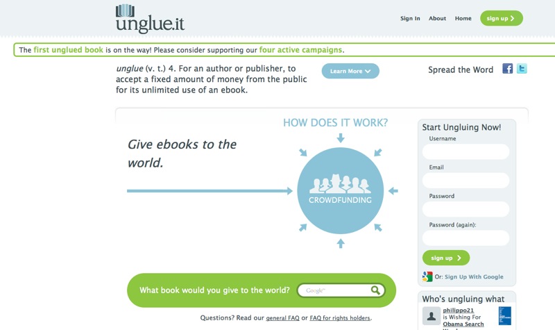 Teilnehmen könne bei Unglue.it jeder Autor oder Verleger, der die Rechte an einem Buch besitzt – egal ob es noch im Handel oder bereits vergriffen ist. Der Rechteinhaber bestimmt den Preis, der ihm die Freigabe des Buches wert ist. Finden sich genug Spender, wird das Buch freigekauft.