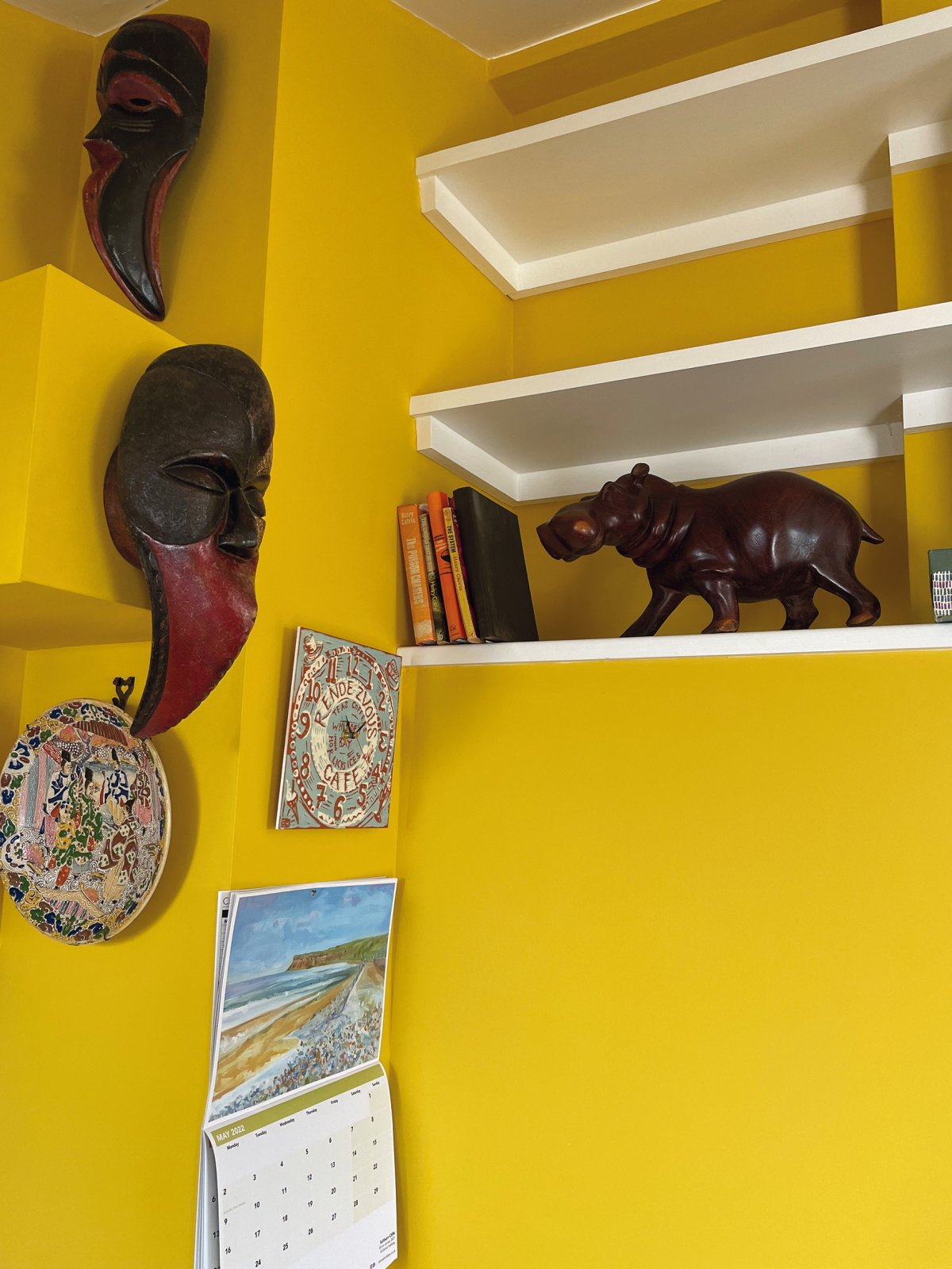 Die einzigen Bücher auf den Regalen sind eine Handvoll Romane, die darauf warten, gelesen zu werden, und Nachschlagewerke, die ich fürs Schreiben benötige. Während ich an „1989“, dem zweiten Allie- Burns-Roman, gearbeitet habe, waren das einige bekannte politische Texte und Sozialgeschichten der Zeit sowie der exzellente Überblick zur Aids-Epidemie von David France. An den Wänden hängt ein Liegestuhl, den ein Freund per Siebdruck bearbeitet hat, der gleichzeitig ein Kunstwerk ist und an den Sommer­tagen als funktionelle Sitzgelegenheit für die Terasse dient; ebenso ein paar Holzmasken aus Simbabwe, ein Kalender mit Drucken eines anderen befreundeten Künstlers und ein geschnitztes Holz-Nilpferd aus Südafrika.