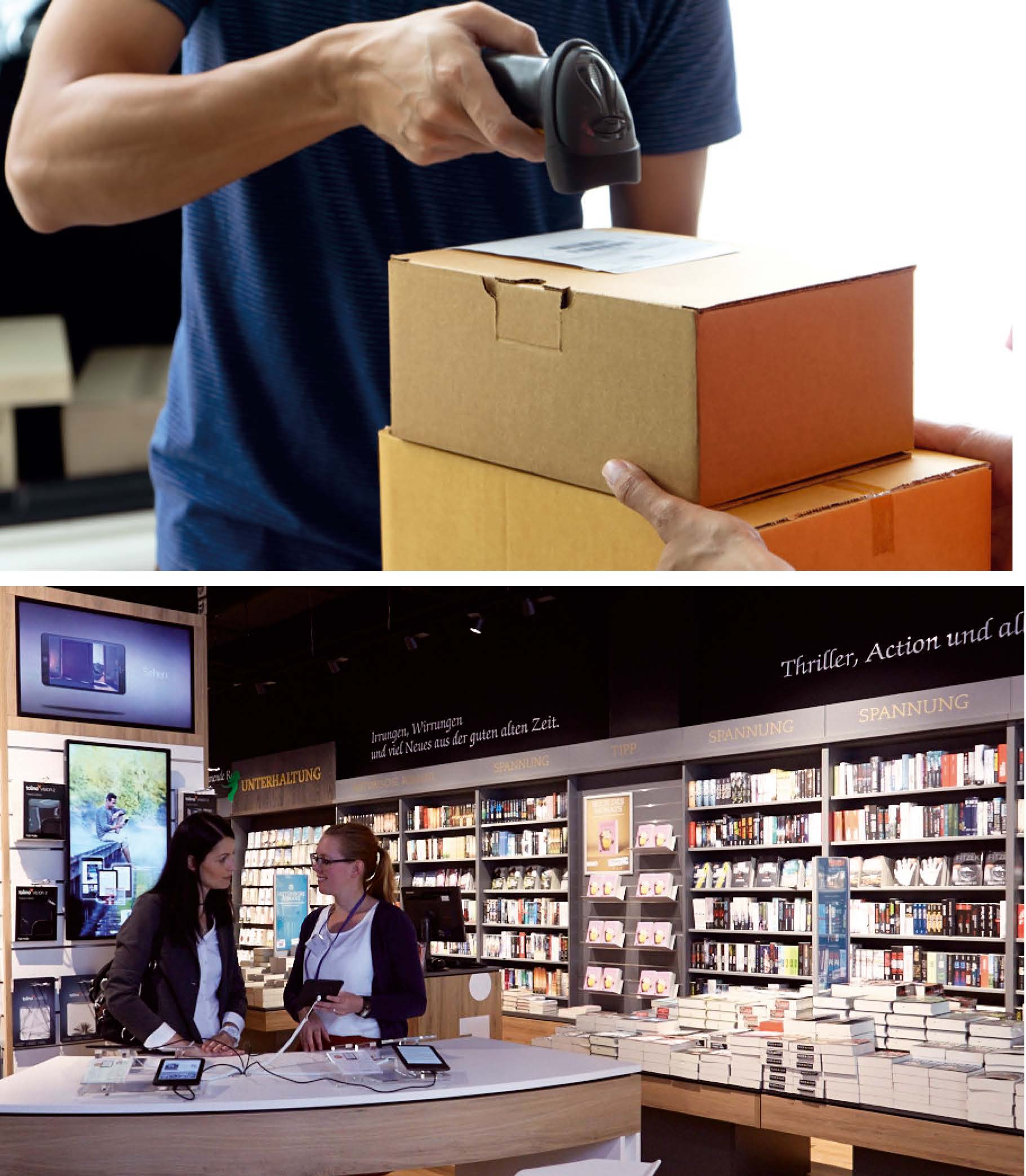 Online-Versand vs. Vor-Ort-Shoppen: Die Entwicklung zugunsten des E-Commerce hat während der Corona-Pandemie an Dynamik gewonnen. Laut E-Commerce-Verband sind dabei zuletzt Multichannel-Händler am stärksten gewachsen. Wie auskömmlich die steigenden Online-Umsätze der stationären Händler sind, ist eine andere Frage. Auch große Multichannel-Buchhändler wie Thalia verweisen darauf, dass Umsatzverlagerungen in den E-Commerce nicht unkritisch sind, weil dort die Margen deutlich geringer ausfallen. (Fotos: 123rf.com/sabthai; Thalia)
