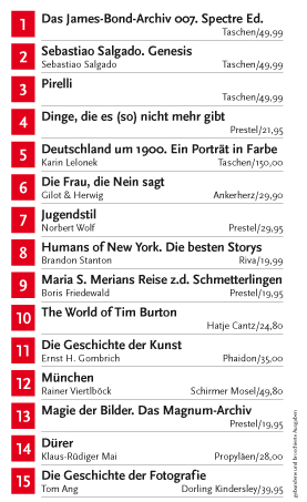 - Als neuer Spitzenreiter der Warengruppe positioniert sich „Das James Bond Archiv 007 – Spectre Edition“. In dem Band, der wie der Fünftplatzierte bei Taschen erschienen ist, sind Bilder und Hintergrundinformationen zu allen „Bond“-Filmen versammelt.
