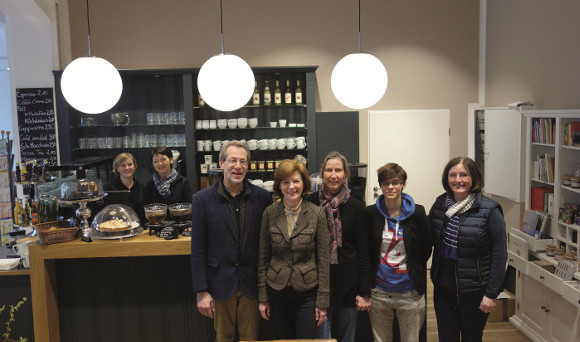 Das neue Café in der Buchhandlung wird von einem in Kürze neben der Buchhandlung einziehenden Feinkostgeschäft mit Speisen beliefert. Geschäftsführerin Elisabeth Röttsches (vorne 2. v.l. ) ist nach einem „unspektakulären Einstieg“ mit dem Besuch in der ersten Woche zufrieden.