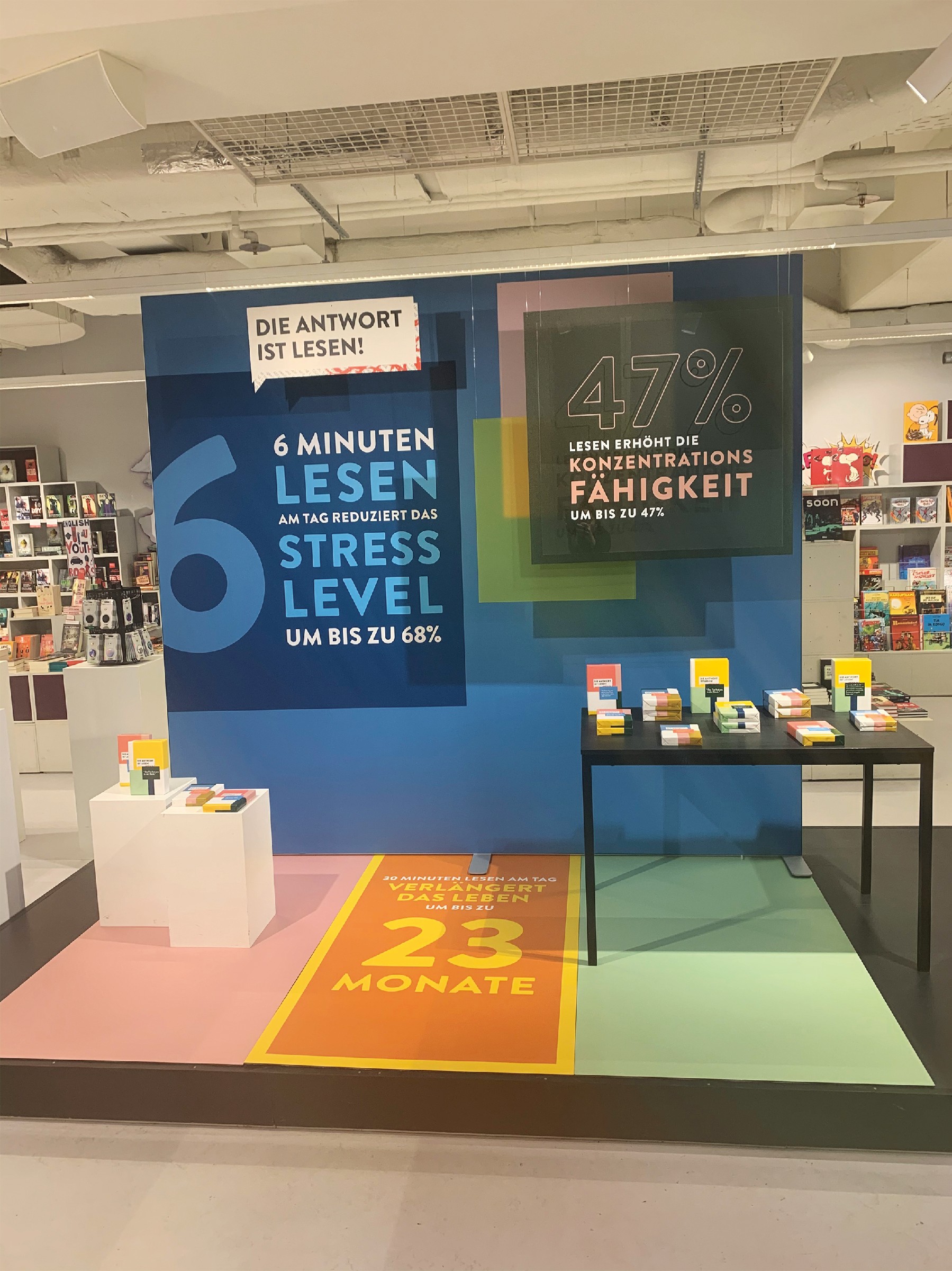 Großer Auftritt im Stammhaus: In Hugendubels Filiale am Münchner Stachus wird die hauseigene Lesekampagne mit markigen Sprüchen und Fakten zum Lesen groß in Szene gesetzt. (Foto: Hugendubel)