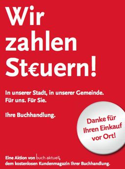 „Wir zahlen Steuern“, lautete 2012 die offensiv vorgetragene stationäre Buchhändler-Klage gegen Online-Händler, namentlich Amazon, die den Markt nicht nur mit kundenorientierten Konzepten, sondern mit Hilfe von Subventionen und Steuervermeidung aufrollten. Die Abbildung zeigt ein Plakat, dass die Kundenzeitschrift „buch aktuell“ damals dem Handel zur Verfügung stellte. Die Wettbewerbsverzerrung ist auch immer wieder ein Thema der Buy-local-Bewegung.