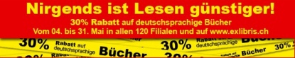 Während Politiker und Verbandsfunktionäre in der Schweiz weiterhin um das geplante Buchpreisbindungsgesetz ringen, verschärft der nach eigenen Angaben größte Medienanbieter der Schweiz, Ex Libris, (wieder) seinen Dumping-Kurs und startet einen neuen Angriff auf das geplante Gesetz. Unter dem Motto „Schweizer Monat des Buches“ verdoppelt die Migros-Tocher bis Ende Mai ihren bisherigen Rabatt auf deutschsprachige Bücher von 15 auf 30%, und zwar im Internet (www.exlibris.ch) sowie in allen 120 Ex Libris-Filialen.
