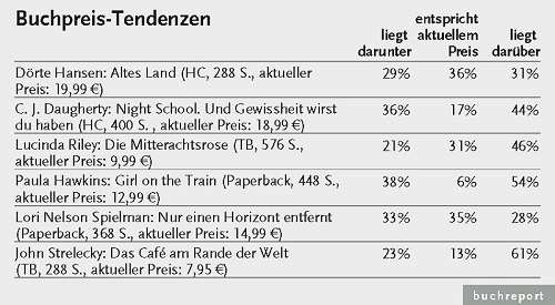 - Der Bestseller „Girl on the Train“ von Paula Hawkins scheint dagegen zu polarisieren: Über die Hälfte findet den Preis (12,99 Euro) für die Paperback-Ausgabe zu niedrig, aber es gibt auch eine starke Minderheit, die das Buch niedriger kalkulieren würde.