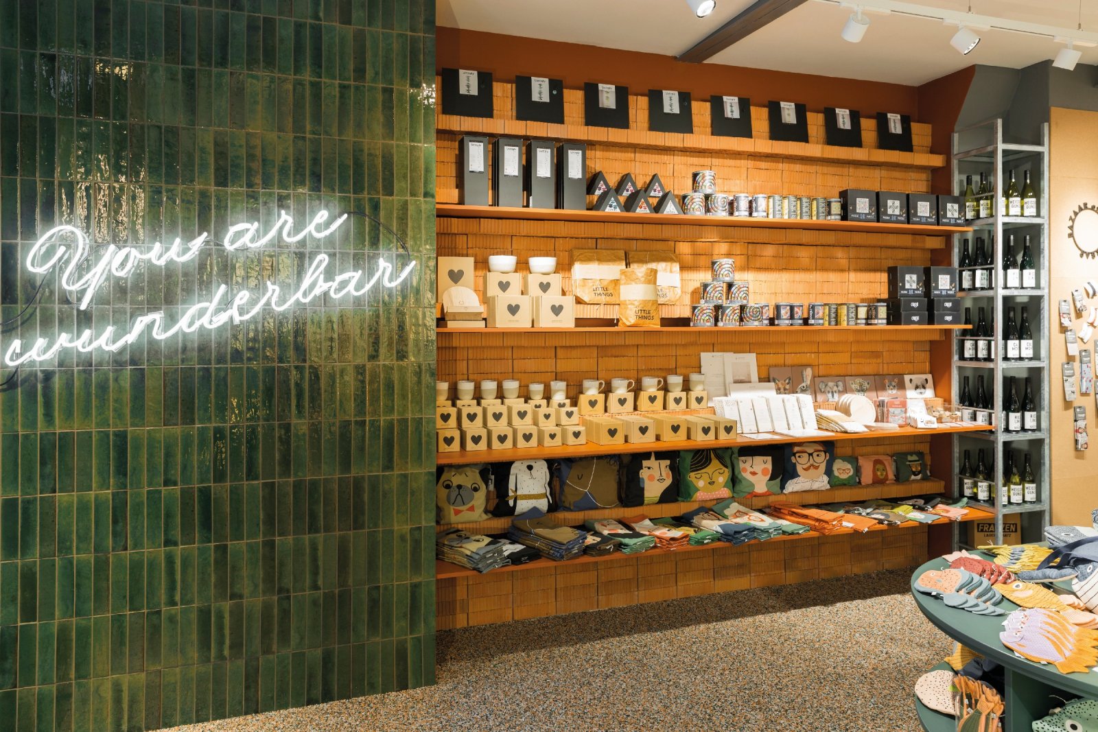 Von der Decke hängende geschwungene Leuchtröhren, Regale, die in den Raum ragen, gedeckte Farben und immer wieder der Schriftzug „you are wunderbar“ – so wagt Robert Duchstein in Koblenz einen gänzlich neuen Auftritt. Mit dem Bazaar of Wunderbar, zentral gelegen neben der Liebfrauenkirche in der Altstadt, will der Regionalfilialist ergänzend zu seinen Reuffel-Buchhandlungen Neues wagen. Der neue Concept Store ist eine eigenständige Marke für Geschenkartikel, an keiner Stelle findet sich das Reuffel-Markenlogo wieder.