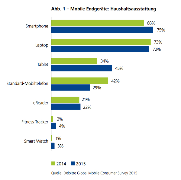 Nach einer aktuellen Studie der Unternehmensberater von Deloitte ist in den vergangenen Monaten im Gerätepark der Deutschen eine Wachablösung erfolgt: Das Smartphone habe den Laptop als die am weitesten verbreitete mobile Gerätekategorie verdrängt: Drei Viertel der Konsumenten haben demnach hierzulande nun Zugriff auf ein smartes Telefon.