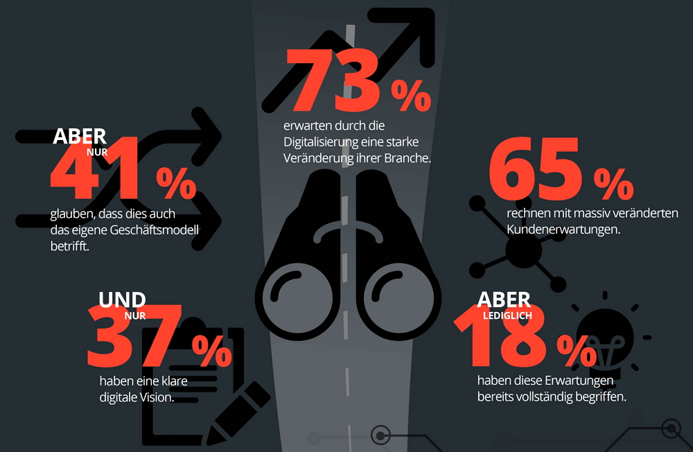 Trotz dieser Hürden befinden sich viele Firmen bereits auf dem Weg: 58% haben erste Initiativen gestartet, 26% gaben an, eine umfassende digitale Transformation eingeleitet oder sogar schon durchgeführt zu haben, 14% stehen noch ganz am Anfang. Denn die Erkenntnis, dass ein Wandel dringend nötig ist, ist in den Köpfen angekommen: 73% der Studienteilnehmer erwarten durch die Digitalisierung eine starke Veränderung ihrer Branche und 53% sind davon überzeugt, dass sich dadurch vor allem Chancen für ihr Unternehmen ergeben.