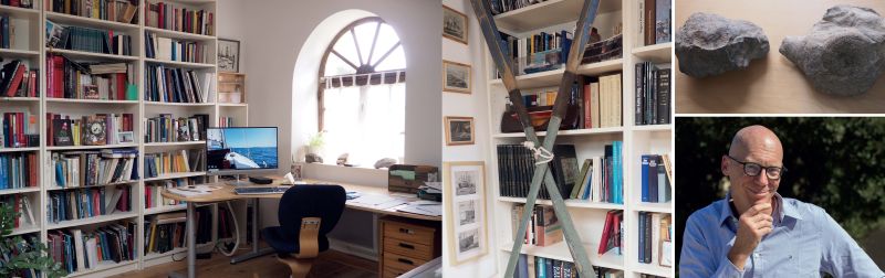 Romane oder Kunstbände haben ihren Platz anderswo im Haus, hier sammeln sich die Werke an, die ich für die Arbeit brauche (oder hoffe, irgendwann mal zu brauchen): Geschichte, Philosophie, Technik, Kriminalistik. Außerdem landen im Zimmer die gestrandeten Relikte des Lebens: Fotos, Bilder, Kram aller Art. An einem Regal hängt beispielsweise ein gelber Plastikfallschirmspringer, den mir die Familie zu meinem Tandem-Sprung geschenkt hat. Auf der Fensterbank stehen Fossilien vom Grund des Lac de Serre-Ponçon in den Alpes-de-Haute-Provence, die bei niedrigem Wasserstand freilagen. Und die Holzruder haben wir beim Renovieren der Ölmühle gefunden. Fragen Sie mich nicht, wie zwei Ruder in eine Ölmühle gekommen sind – das wäre vielleicht die Idee für einen neuen Krimi.